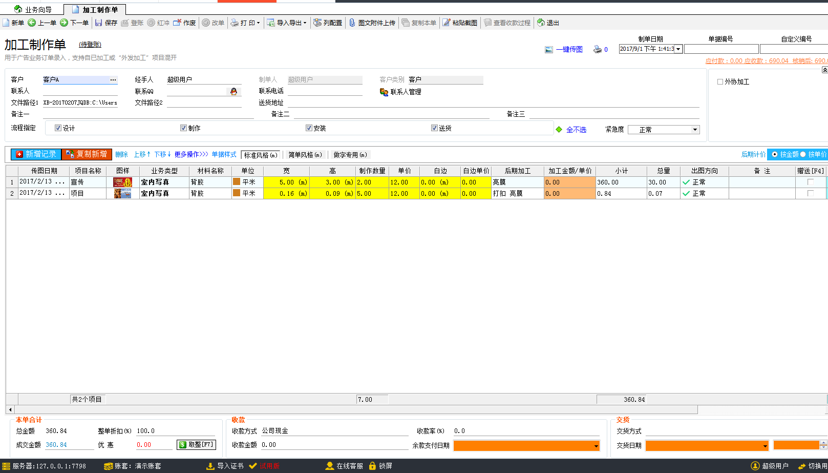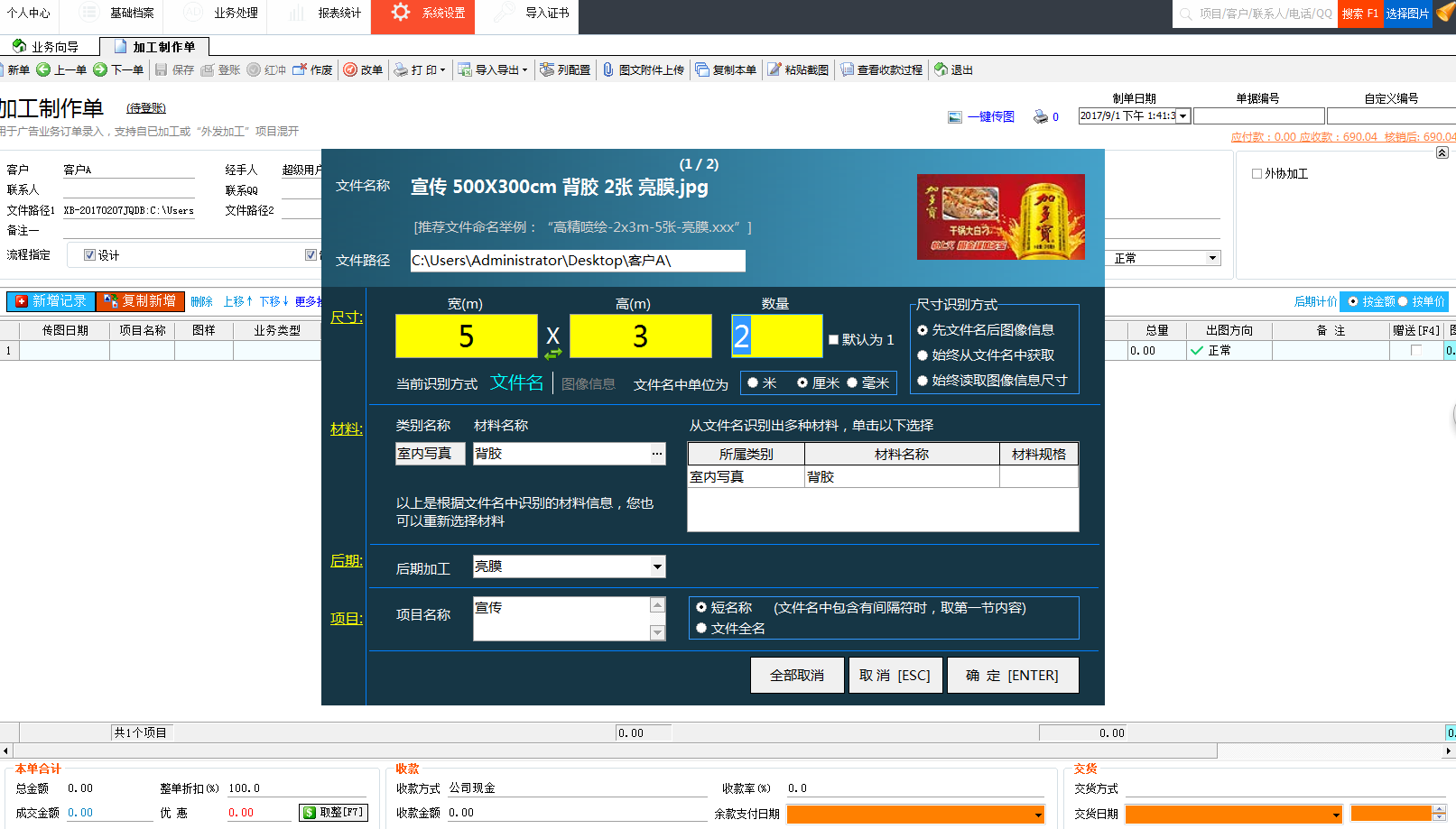 1.快速開單為廣告公司的業務員提供了快速開單的功能,拖動圖片到軟件,軟件可以自動識別圖片中的信息,包含項目名稱(制作內容)、材料名稱、寬、高、制作數量以及后期加工等信息,材料單價此前已經綁定,自動顯示,所以整張單據都不需要再手動去填寫相關的業務信息,廣告公司管理軟件就已經自動開好單據。保存登賬計入財務。