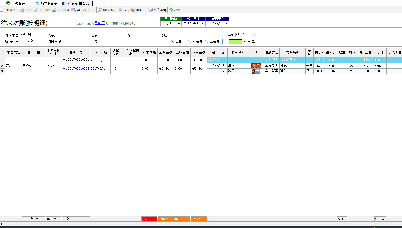 對賬時,選擇對應客戶及日期。執行查詢過后,該時期內該客戶所有的業務單都會顯示出來,包括單據明細、已結金額、未結金額等,已經結清單據用綠底標記。各單據直觀明了,不會再出現漏單丟單或錯單的情況。